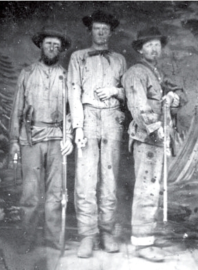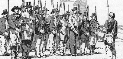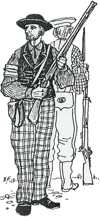 Confederate Recruit (C.S.) – The soldiers of Colonel John “Coon” Thornton’s Provisional Confederate army wore a mixture of Captured federal uniforms, ragged civilian clothing, and a small sprinkling of homemade confederate uniform parts. There really was not a whole lot of uniforms and what they did have was largely found while on the campaign. Many of the new recruits joined up without weapons and had to arm themselves after the various raids & skirmishes. Those who did bring weapons had a lot of civilian style muskets, shotguns, or captured 3 band muskets. Confederate Re-enactors for the Plattsburg event should largely stay away from the Gray Confederate issued jackets and uniforms (except where noted for the Paw Paw battalion) and attempt to have a more civilian style look. A sprinkling of a few gray and butternut jackets would be OK as long as it does not appear as uniformity in nature and as long as they are plain without any branch color on the cuffs and collar. Guerilla shirts are very acceptable. Thing to remember here is that the rebs at Plattsburg didn't receive their stuff from an official Confederate depot. Everything was supplied on their own. Overall Confederate impression should be a very rough and dirty look overall.